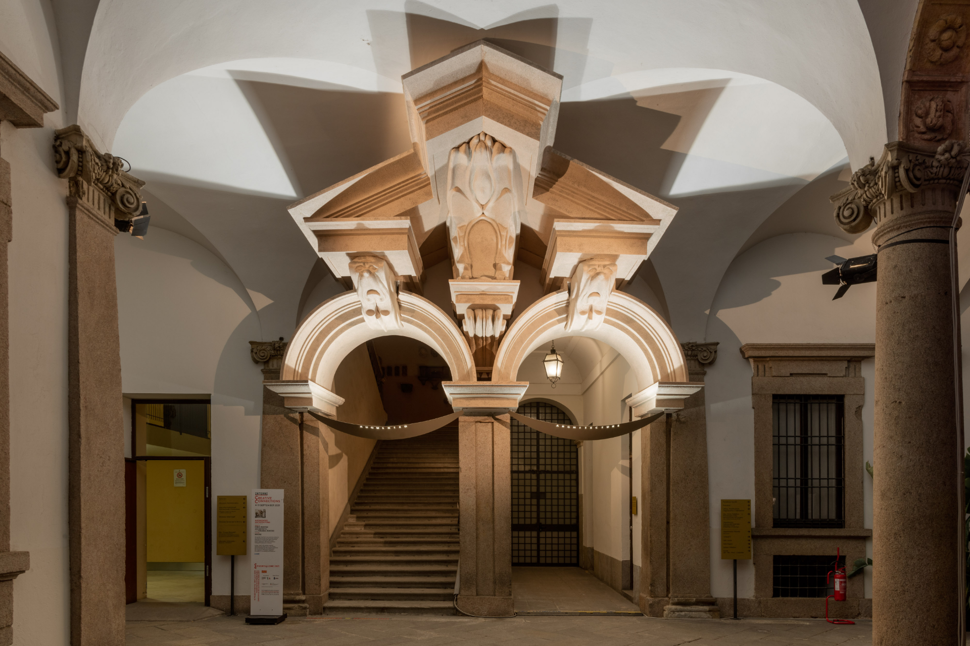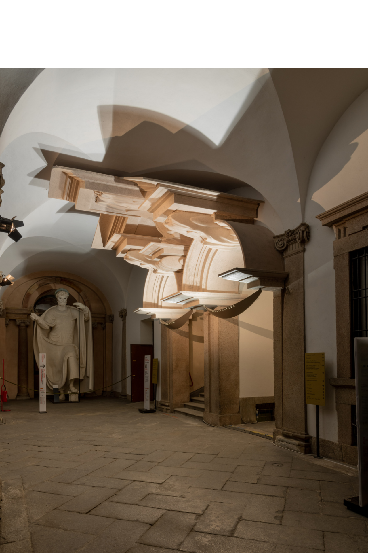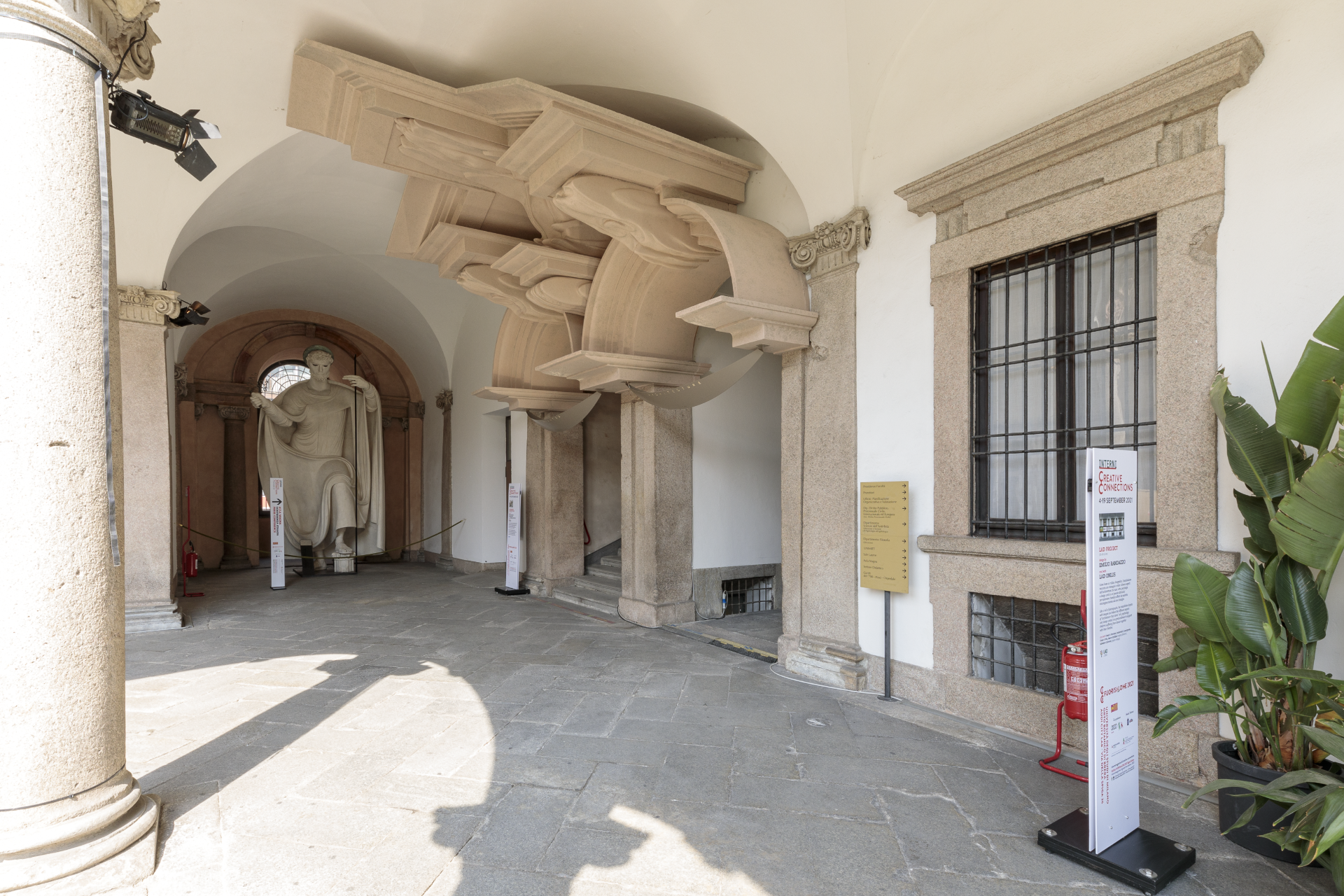 L’installazione consiste in una riproduzione distorta della parte superiore di un portale del cortile dell’Università Statale di Milano.
