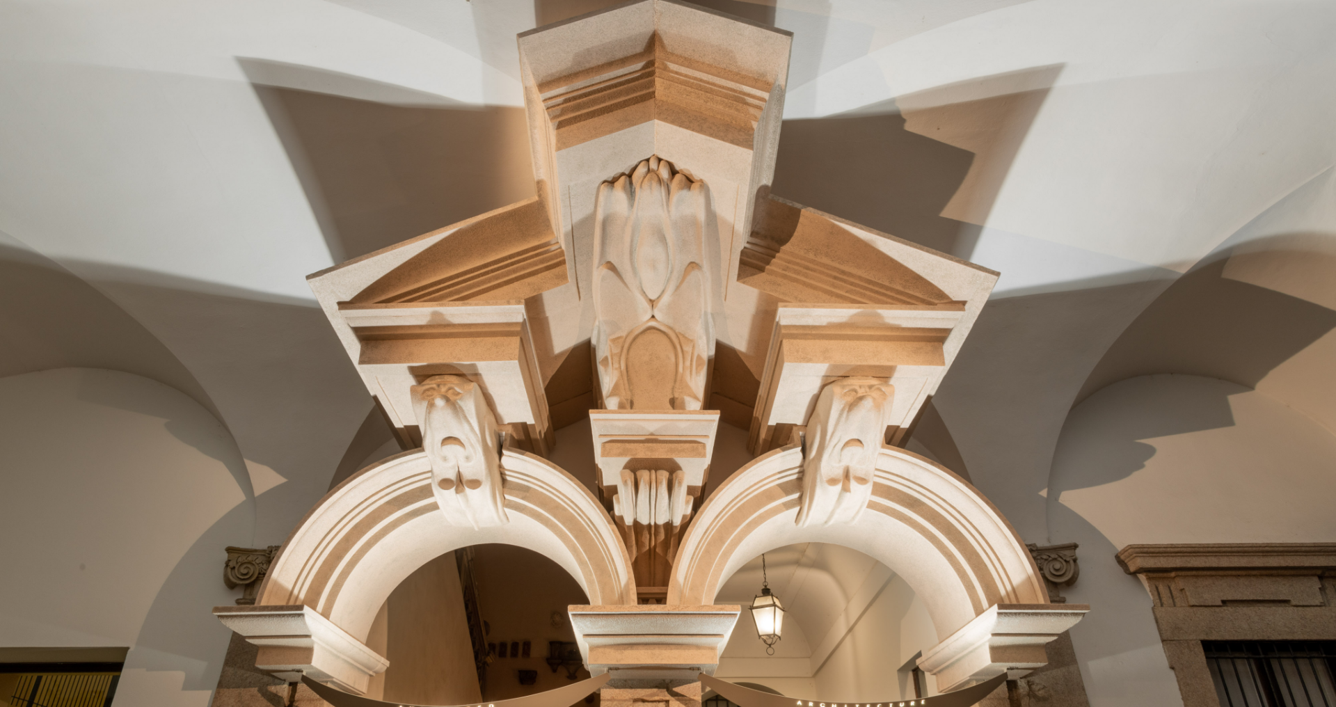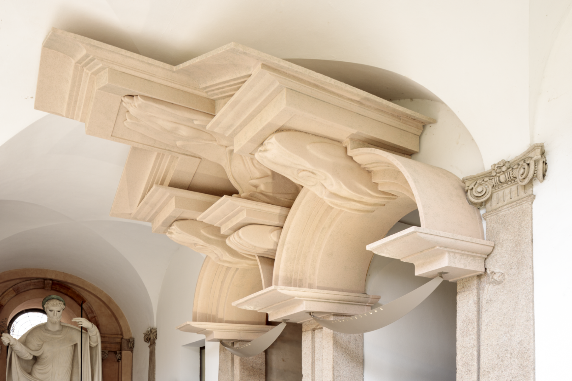 L’opera è realizzata attraverso una scansione digitale delle modanature e dettagli scultorei dell’elemento architettonico originale, estrusi digitalmente in maniera esponenziale lungo l’asse orizzontale, e poi scolpiti grazie a tecnologie produttive d’avanguardia.