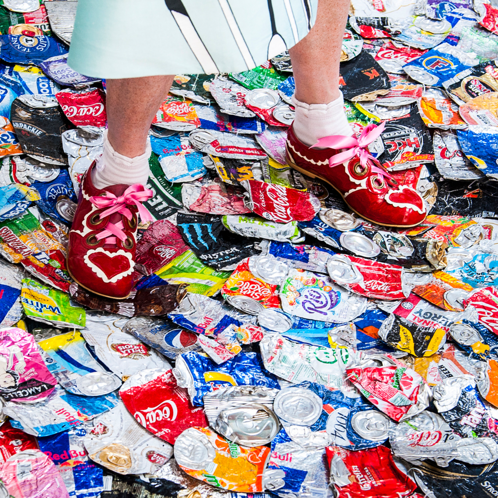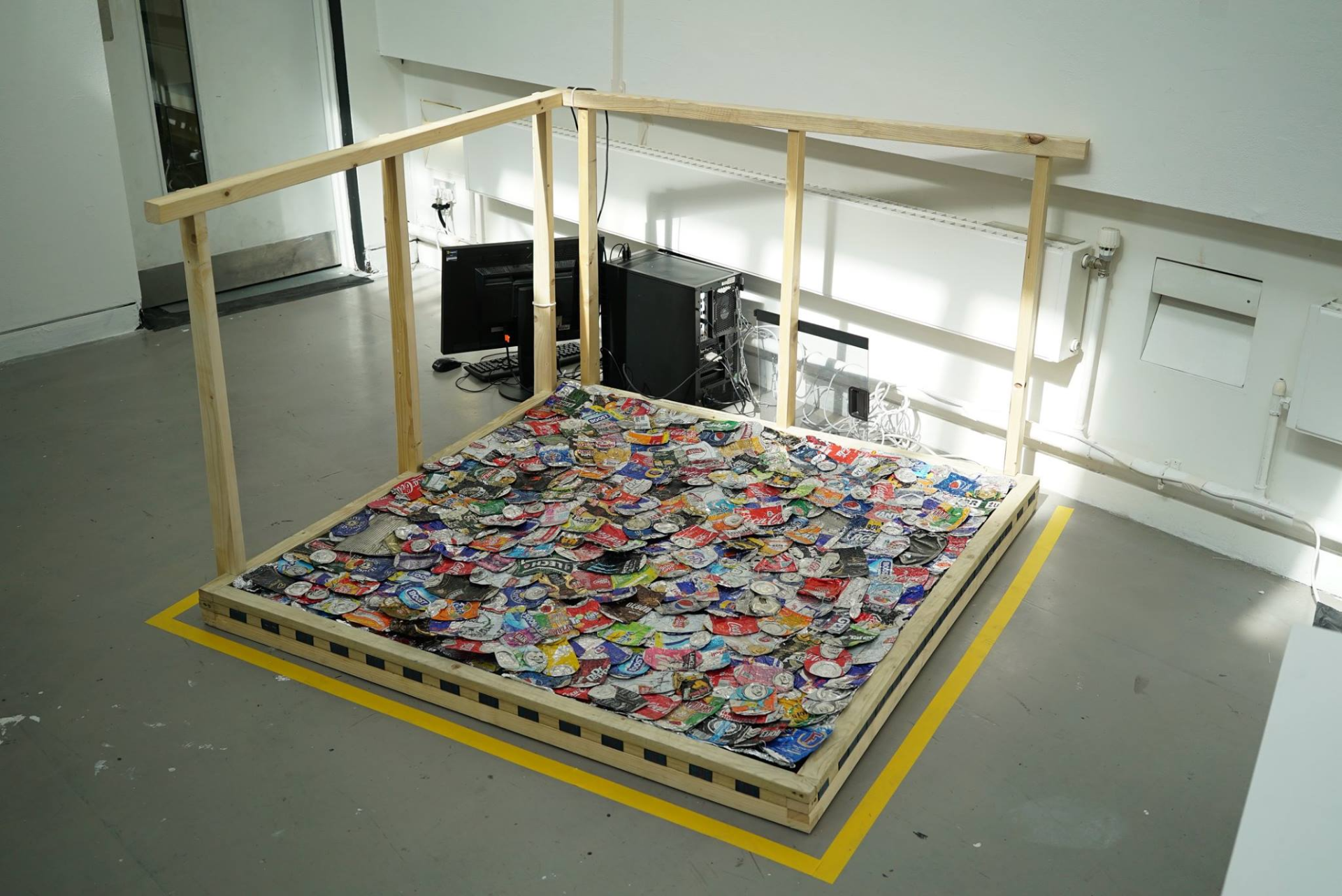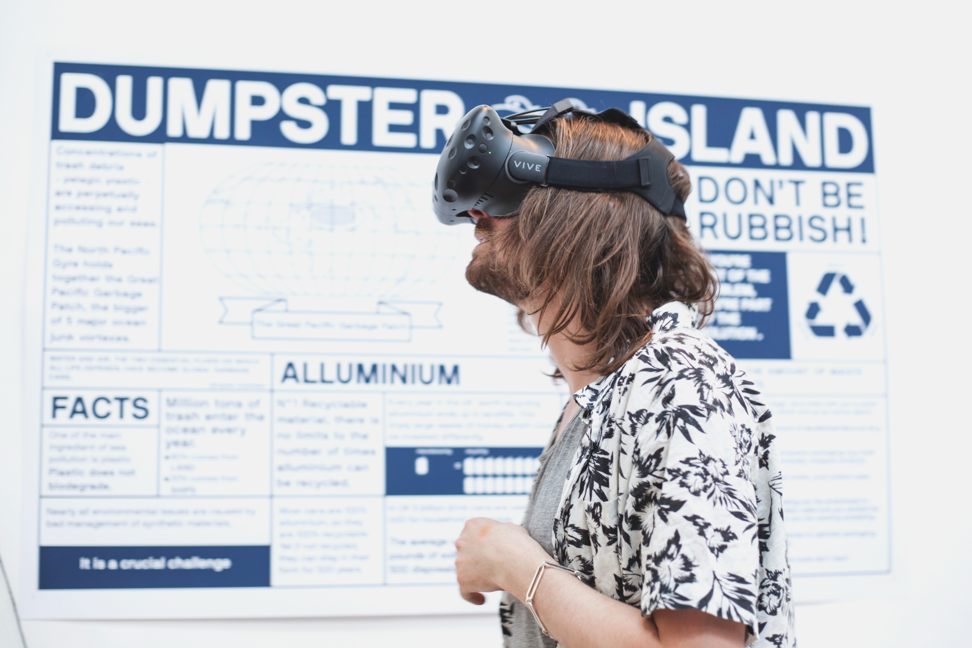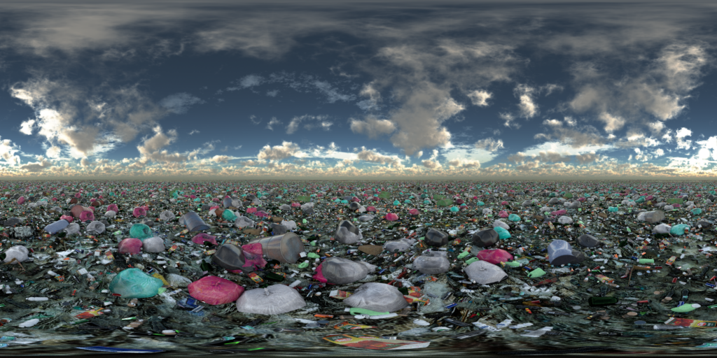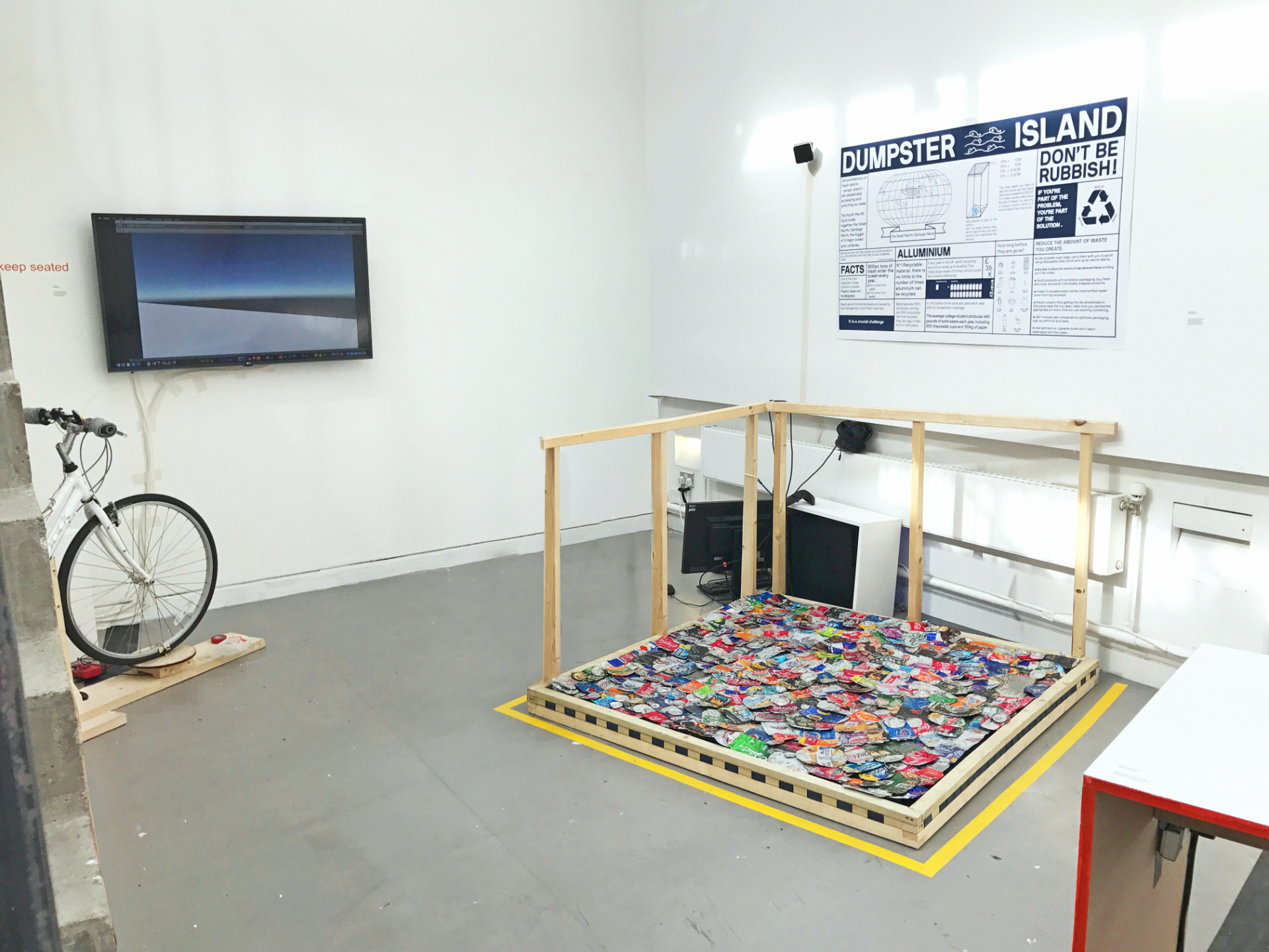 Il visore VR immerge lo spettatore in un mare saturo di immondizia. Questa visione apocalittica e distopica viene vissuta stando su una piattaforma soffice, coperta di lattine schiacciate raccolte dai marciapiedi e strade di Londra, come a stare in piedi su una piccola porzione dell’isola di plastica nell’oceano.