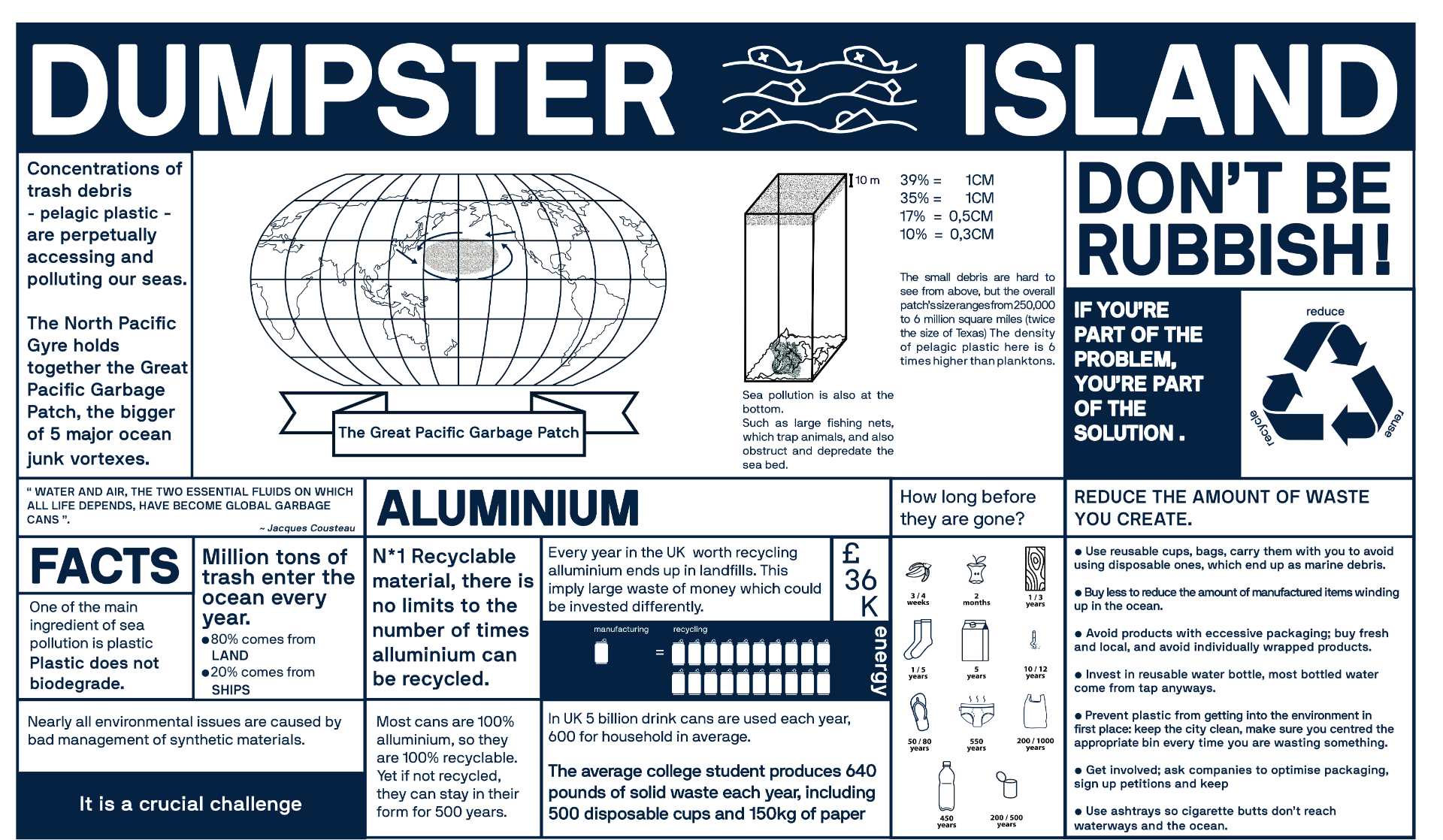 Il progetto ha lo scopo di aumentare la consapevolezza sull’impatto devastante dei detriti umani sulla vita marina, con il caso particolare del Great Pacific Garbage Patch.