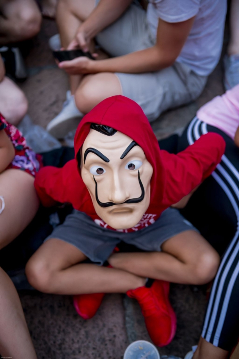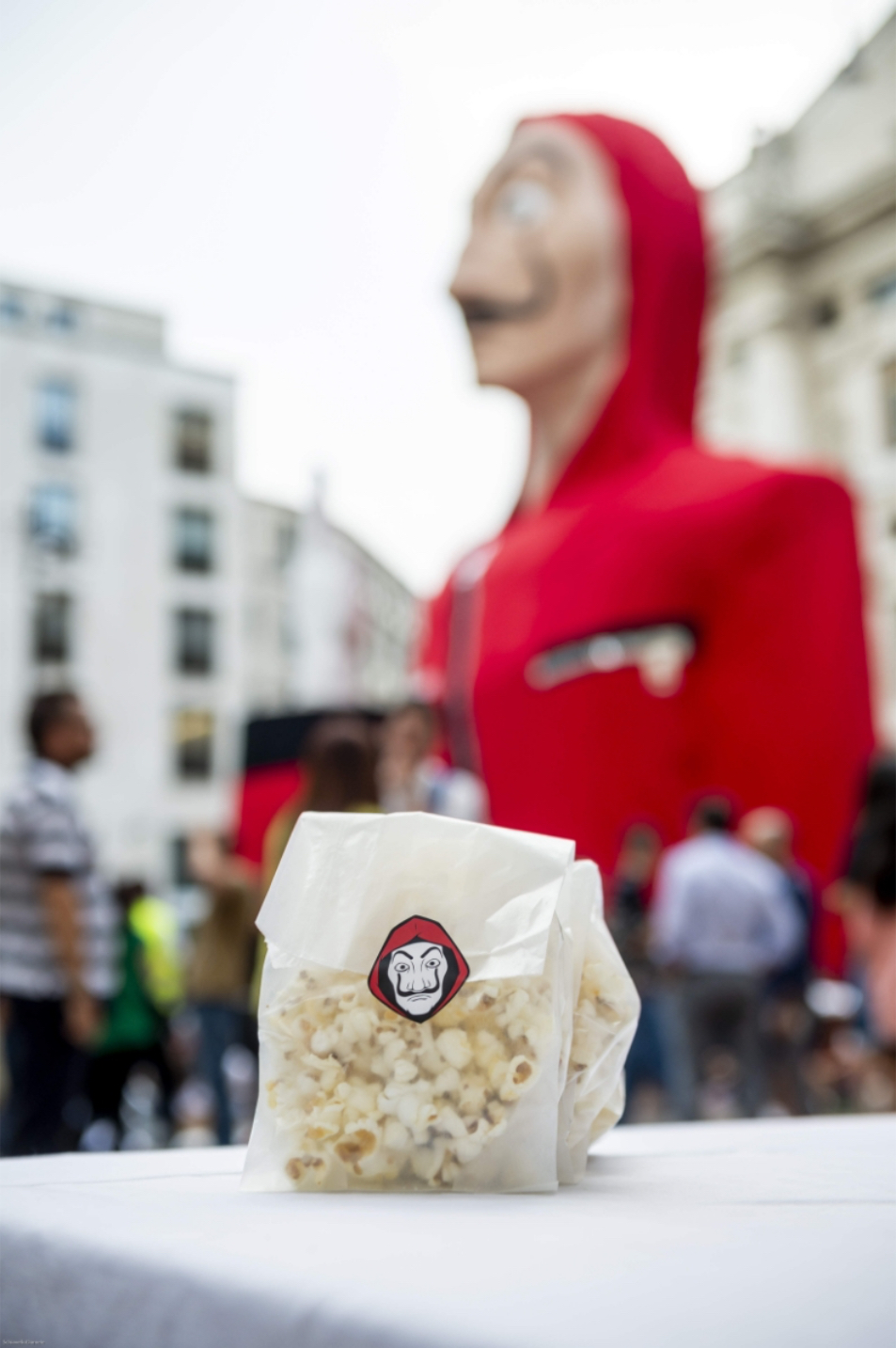 Stuarts e personale in costume, sacchetti brandizzati con dentro pop-corn per godersi lo spettacolo e comodi cuscini sui quali sedersi sono stati pensati e realizzati per “costellare” l’evento con un’illustrazione graficizzata dell’iconica maschera di Dalì incappucciata di rosso che caratterizza la serie.