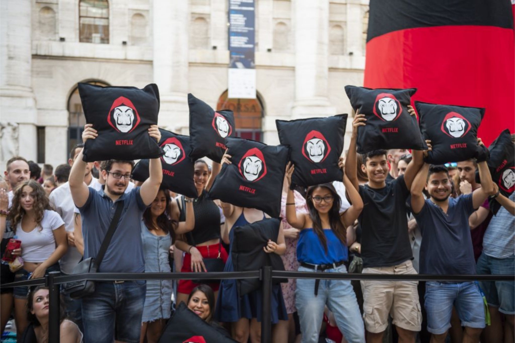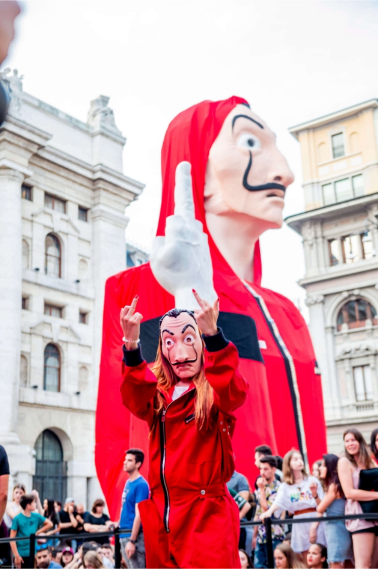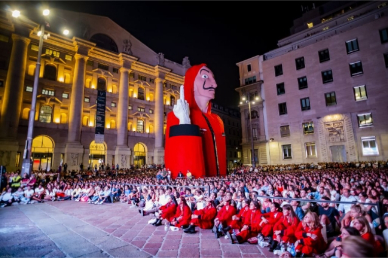 Prop buying e realizzazione dei gadget distrubuiti durante il lancio in anteprima della terza stagione di La Casa De Papel, avvenuto in piazza Affari a Milano attraverso un evento spettacolare, dove hanno partecipato più di 5.000 persone di tutte le età. La piazza si è trasformata in un enorme cinema all’aperto con un’enorme scultura dedicata inglobava l’opera d’arte L.O.V.E. di Maurizio Cattelan. Il personale, vestito con tuta rossa e maschera della serie, distribuiva agli spettatori cuscini brandizzati e popcorn per godersi al meglio la visione sul grande schermo.